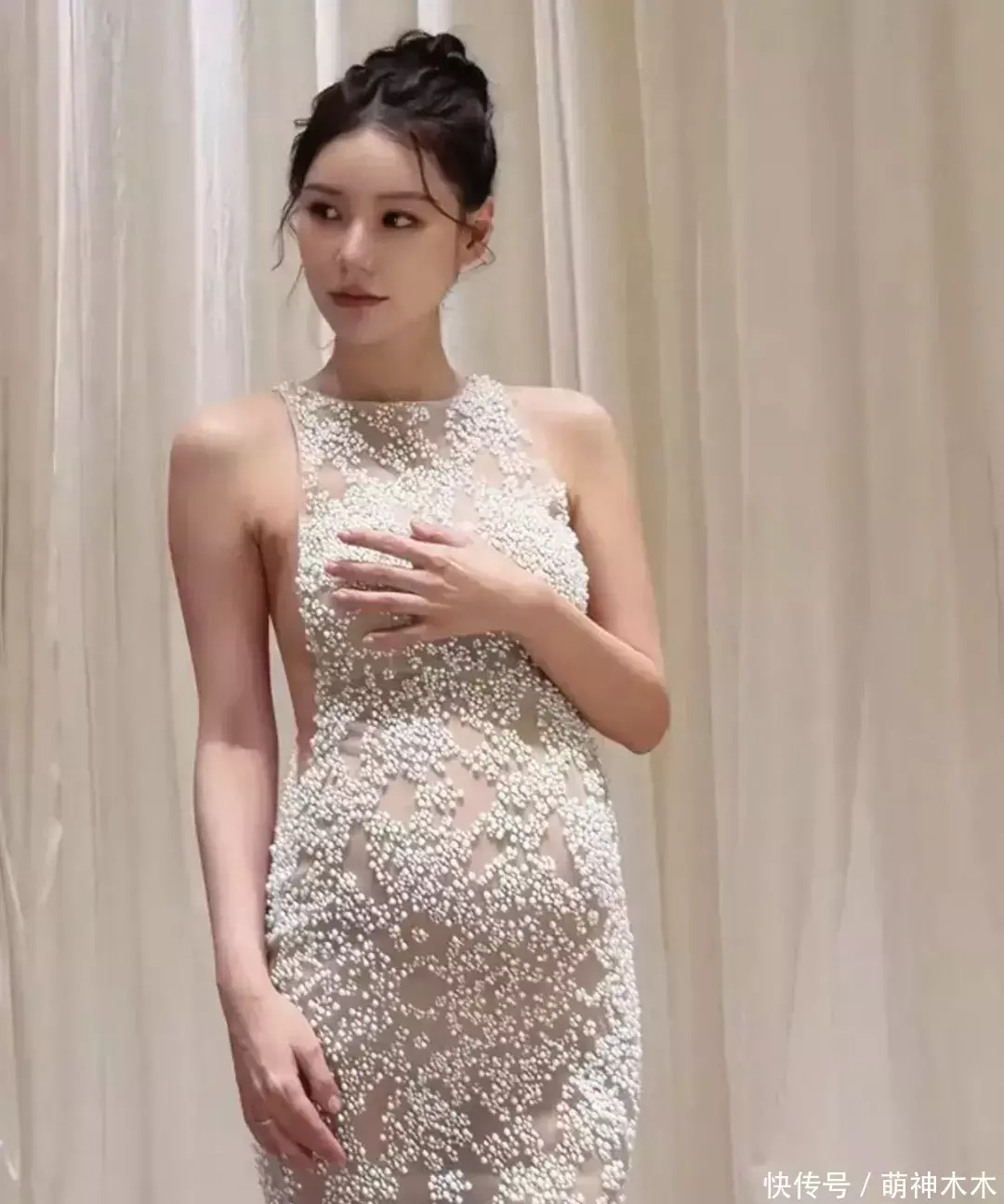 和上一套将孕肚大大方方露出来的衣服不同的是,另外两套衣服都是不露肚的。一套是珍珠鱼尾礼服裙,这套裙子是修身的款式,所以大家能够看到马筱梅弧度明显的孕肚;